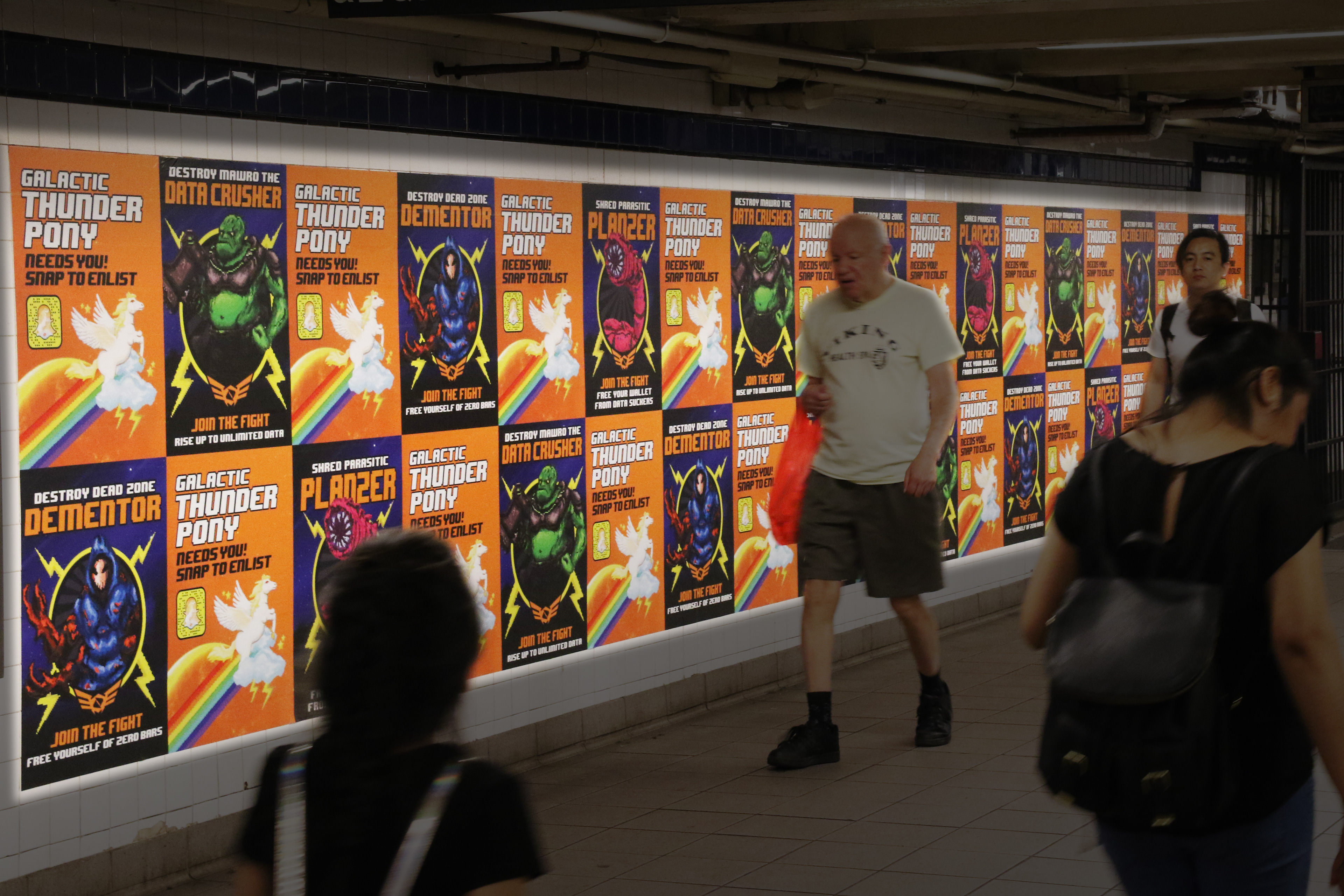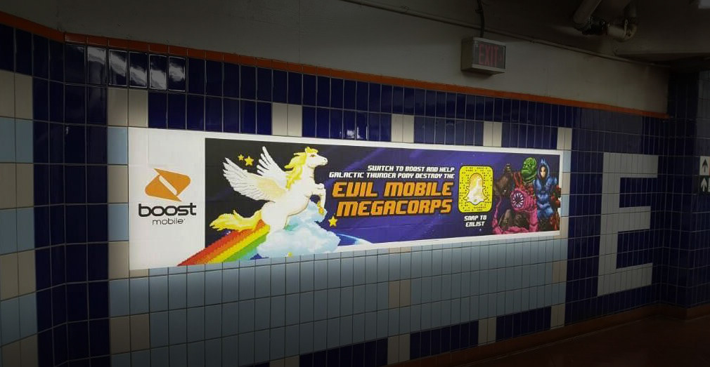 Boost Mobile We collaborated with our agency Scheifer Chop Shop, to create a fun and addictive game that was exclusive to riders via a Snapchat code printed on our subway takeover tactics in stations in New York and Philadelphia. We worked with Blue Bite to geofence the stations, distributing banners ads that pointed to the game directly as well. Those who have played Galaga will find it has a familiar gameplay. You maneuver Galactic Thunder Pony as it vanquishes the evil mobile megacorps and fights off an array of missiles, bombs and falling debris – each rooted in specific pain points and general evils of our competition. I even have a villain named after me: Mawro The Data Crusher! http://www.galacticthunderpony.com/